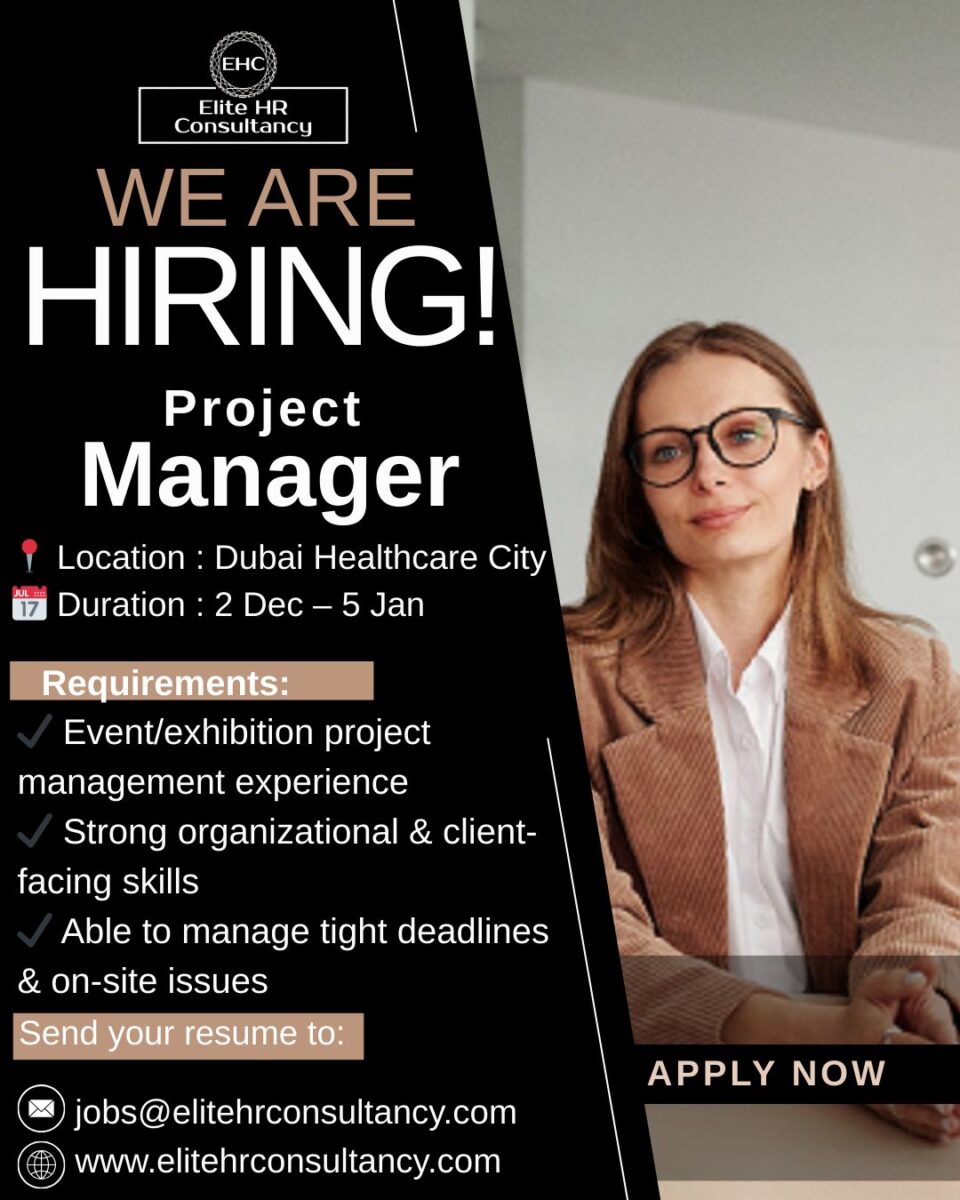 📌 تعلن Elite HR Consultancy عن توفر وظائف مدير مشاريع فعاليات 2025 للعمل في مدينة دبي الطبية لإدارة فعالية الكريسماس خلال الفترة من 2 ديسمبر حتى 5 يناير.