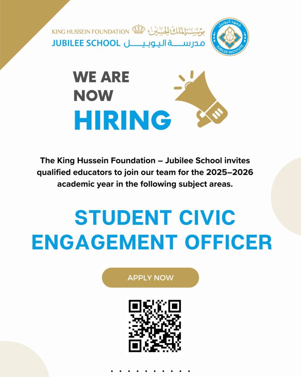 📢 تعلن Jubilee School – عمان، الأردن عن توفر وظائف مسؤول خدمة مجتمعية الطلاب 2025 للعمل على تطوير وتنفيذ برامج خدمة المجتمع وتعزيز التفاعل الطلابي والمسؤولية المدنية.