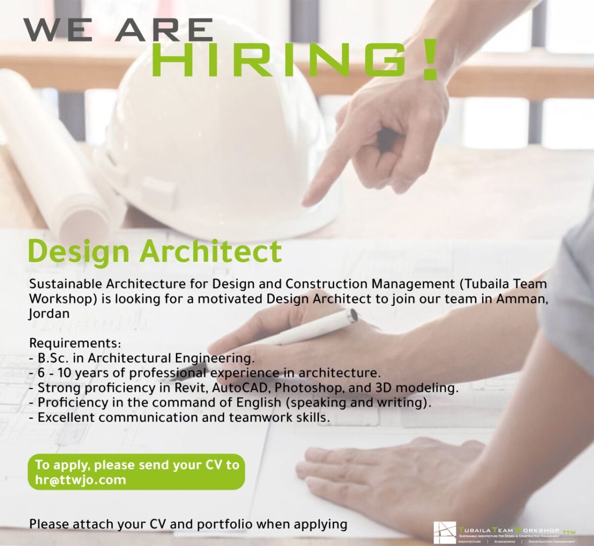 تعلن شركة Tubaila Team Workshop المتخصصة في إدارة التصميم والبناء المستدام عن حاجتها إلى تعيين Design Architect مؤهل وذو خبرة مهنية للانضمام إلى فريقها في عمّان – الأردن لعام 2025.