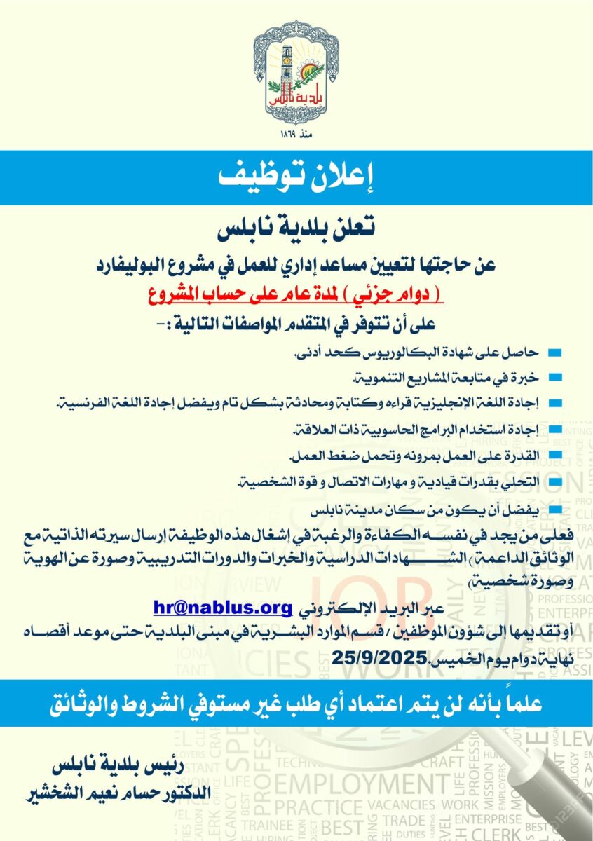 تعلن بلدية نابلس عن حاجتها لتعيين مساعد/ة إداري للعمل في مشروع البوليفارد بدوام جزئي لمدة عام، ضمن فريق المشروع لعام 2025.
