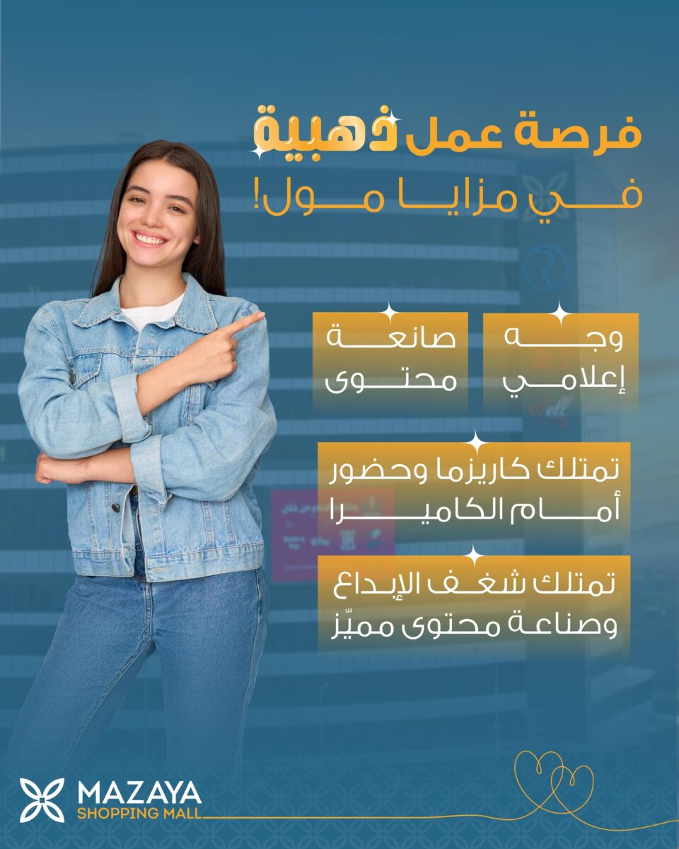 تعلن مزايا مول عن حاجتها لتعيين صانعة محتوى للعمل ضمن فريقها الإعلامي والإبداعي، وفقًا للشروط التالية: