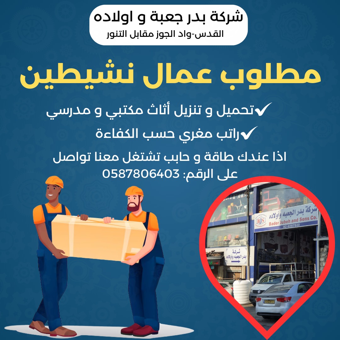 مطلوب عمال تحميل وتنزيل للعمل لدى شركة بدر جعبة وأولاده في القدس، واد الجوز مقابل التنور. آخر موعد للتقديم: 2025-10-13.