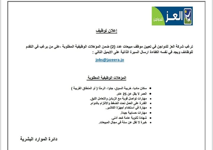 تعلن شركة العز للدواجن عن حاجتها لتعيين موظفات مبيعات عدد (2) للعمل ضمن فريقها في منطقة غرب عمان – صويلح، الرضا، الجبيهة أو المناطق المجاورة.