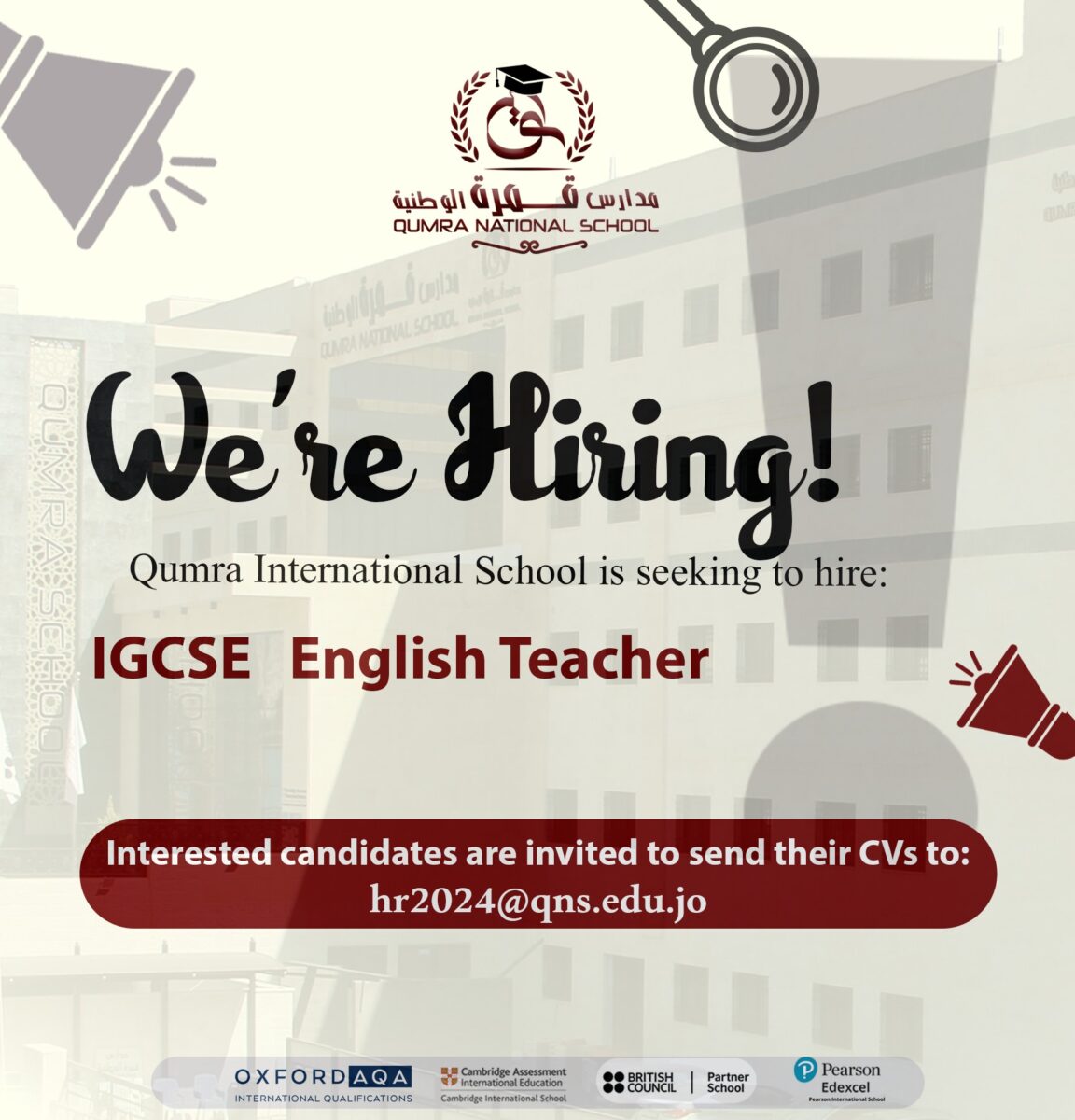 تعلن مدارس قمرة الوطنية في عمان، الأردن عن حاجتها لتعيين معلم/ة لغة إنجليزية – IGCSE لعام 2025.