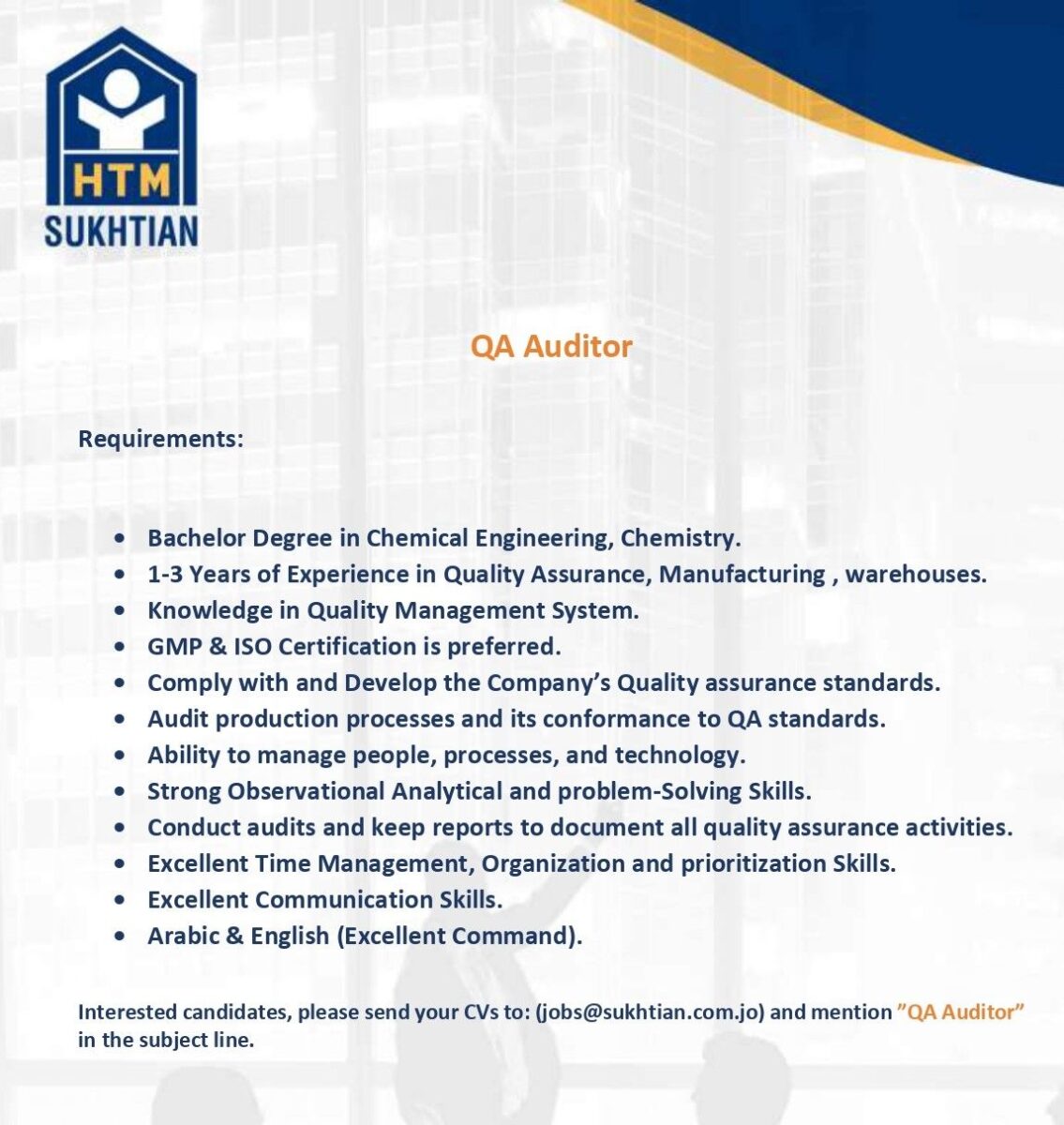 وظائف QA Auditor في الأردن – شركة HTM Sukhtian تطلب موظفين لعام 2025