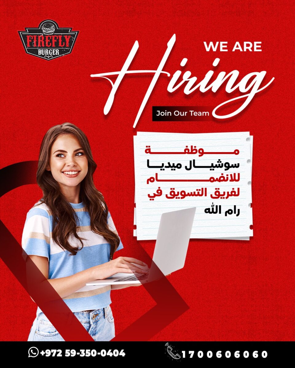 تعلن Firefly Burger PS – رام الله والبيرة عن حاجتها لتوظيف موظفة منشئة محتوى للسوشال ميديا للانضمام إلى فريق التسويق في أفرع مطاعمها.