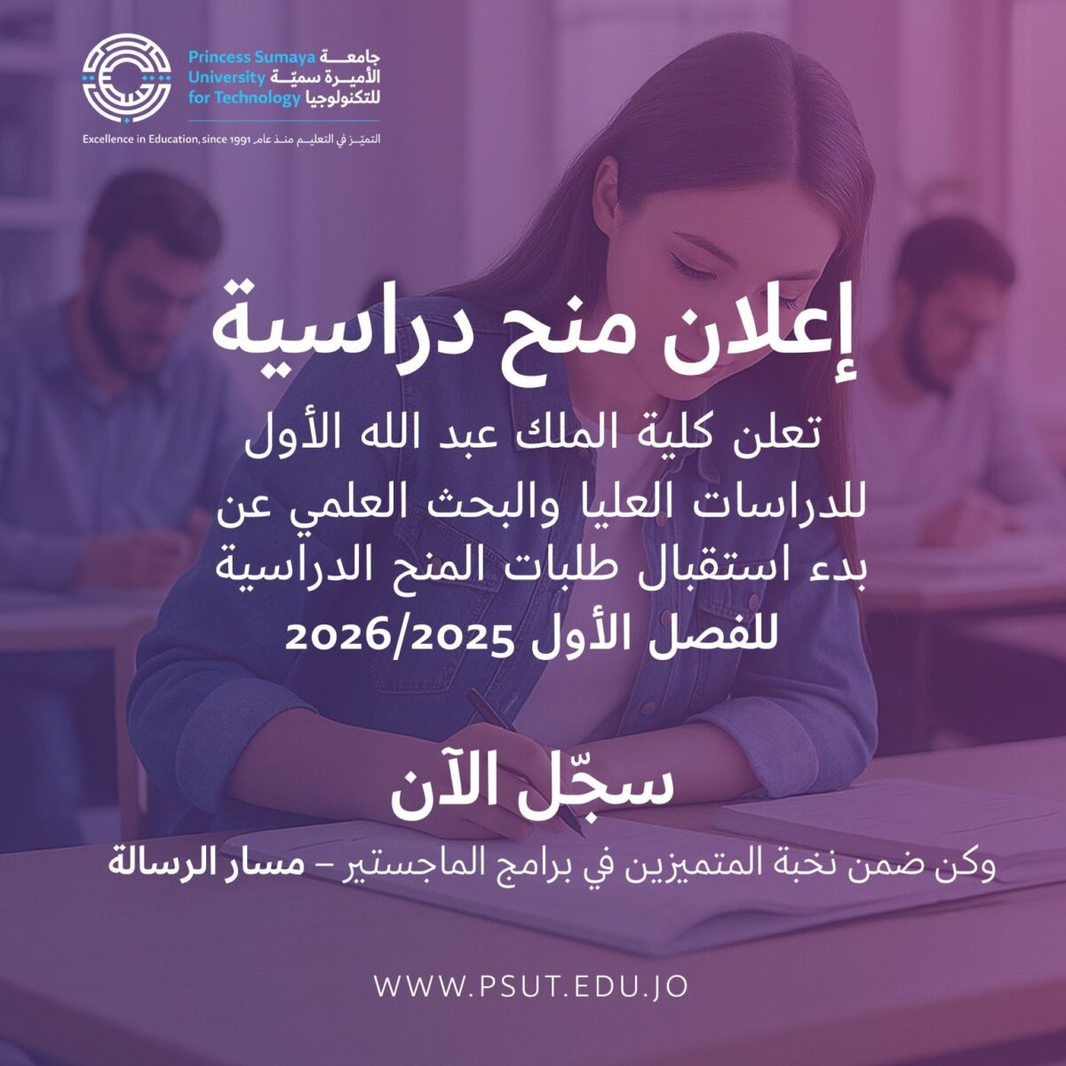 تعلن جامعة الأميرة سمية للتكنولوجيا – كلية الملك عبد الله الأول للدراسات العليا والبحث العلمي عن منح ماجستير 2025 للطلاب المتميزين في الأردن، ضمن برامج علم البيانات لمسار الرسالة، للفصل الدراسي الأول من العام الجامعي 2026/2025.