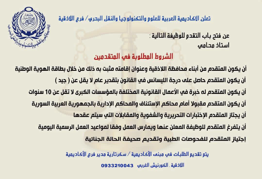 عنوان الوظيفة: محامي – الأكاديمية العربية للعلوم والتكنولوجيا والنقل البحري – فرع اللاذقية – 2025
