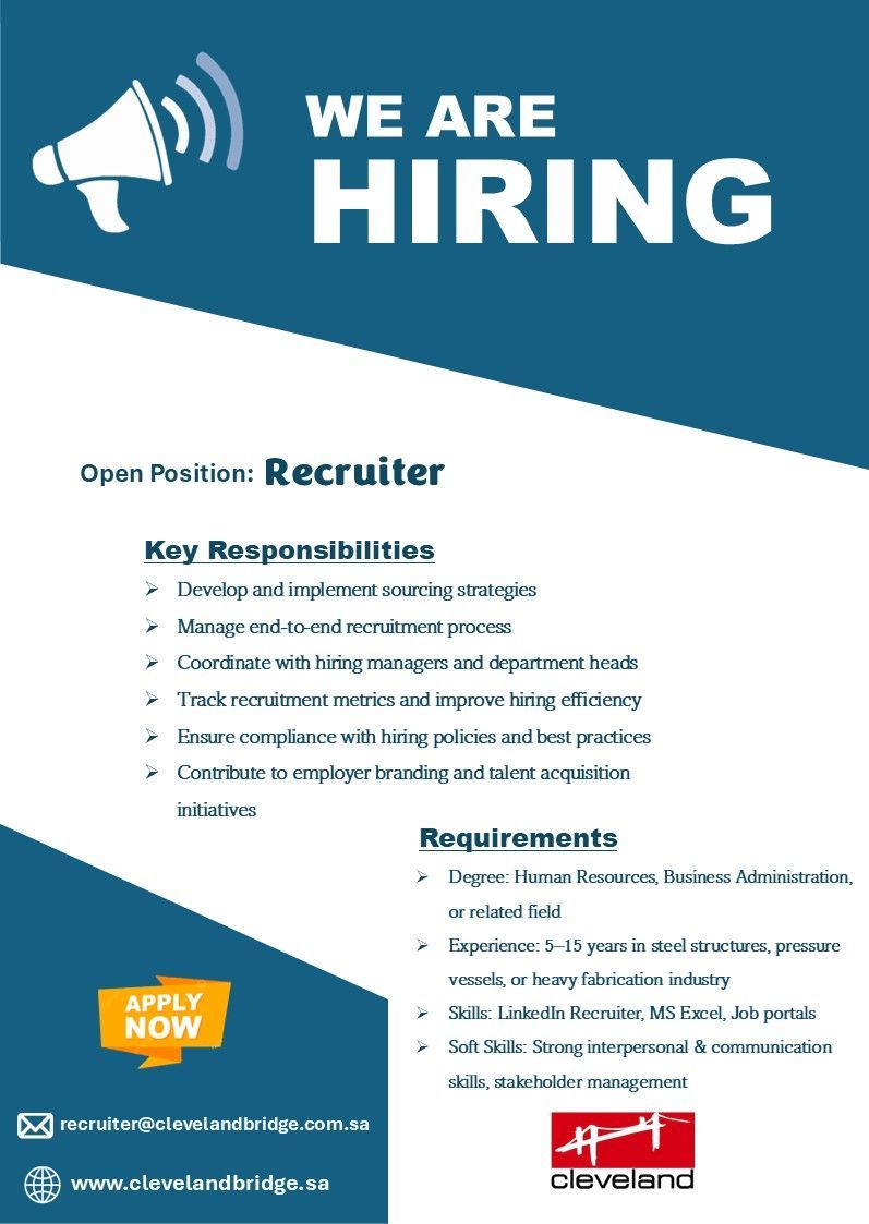 تُعلن شركة Cleveland Bridge في المملكة العربية السعودية عن توفر فرصة مميزة للعمل في مجال الموارد البشرية، حيث تسعى لتوظيف Recruiter بخبرة مهنية عالية في مجال الهياكل الفولاذية أو أوعية الضغط.