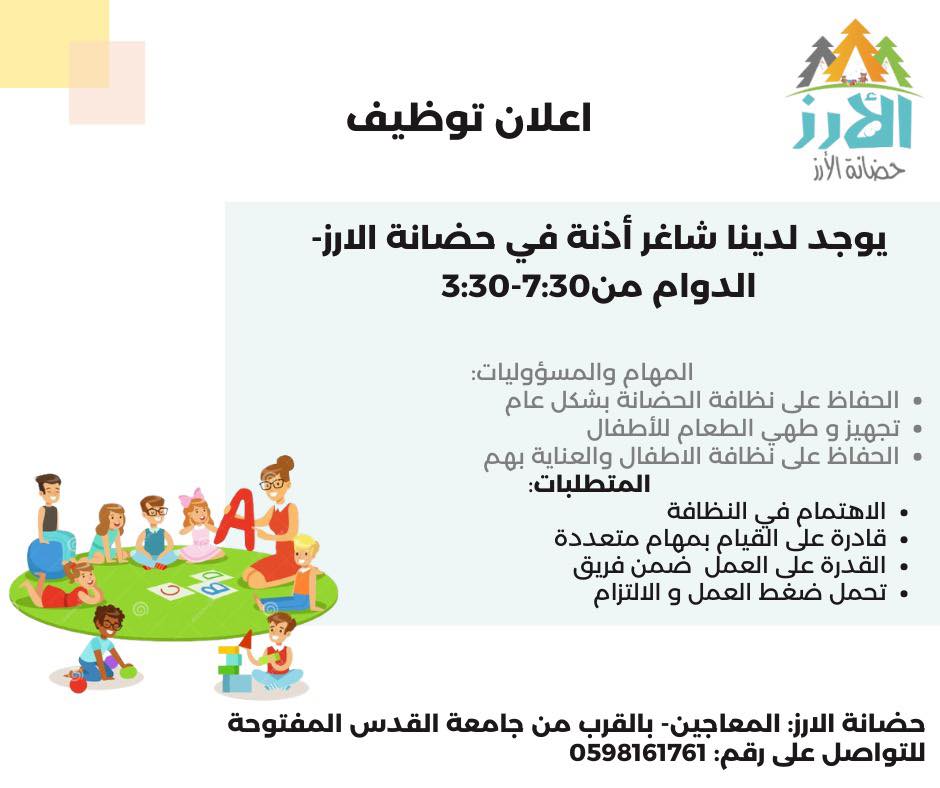تعلن حضانة الأرز عن حاجتها لتوظيف أذنة للانضمام إلى فريق العمل في نابلس، المعاجين، بالقرب من جامعة القدس المفتوحة.