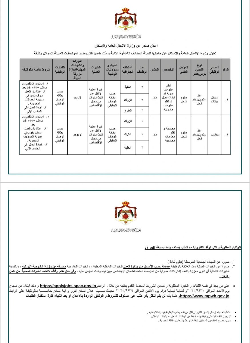 تعلن وزارة الأشغال العامة والإسكان عن توفر عدد من الوظائف الشاغرة للعام 2025، في مجال المحاسبة وهندسة الحاسوب، للعمل في محافظات الزرقاء، الكرك، الطفيلة، حسب الشروط التالية: