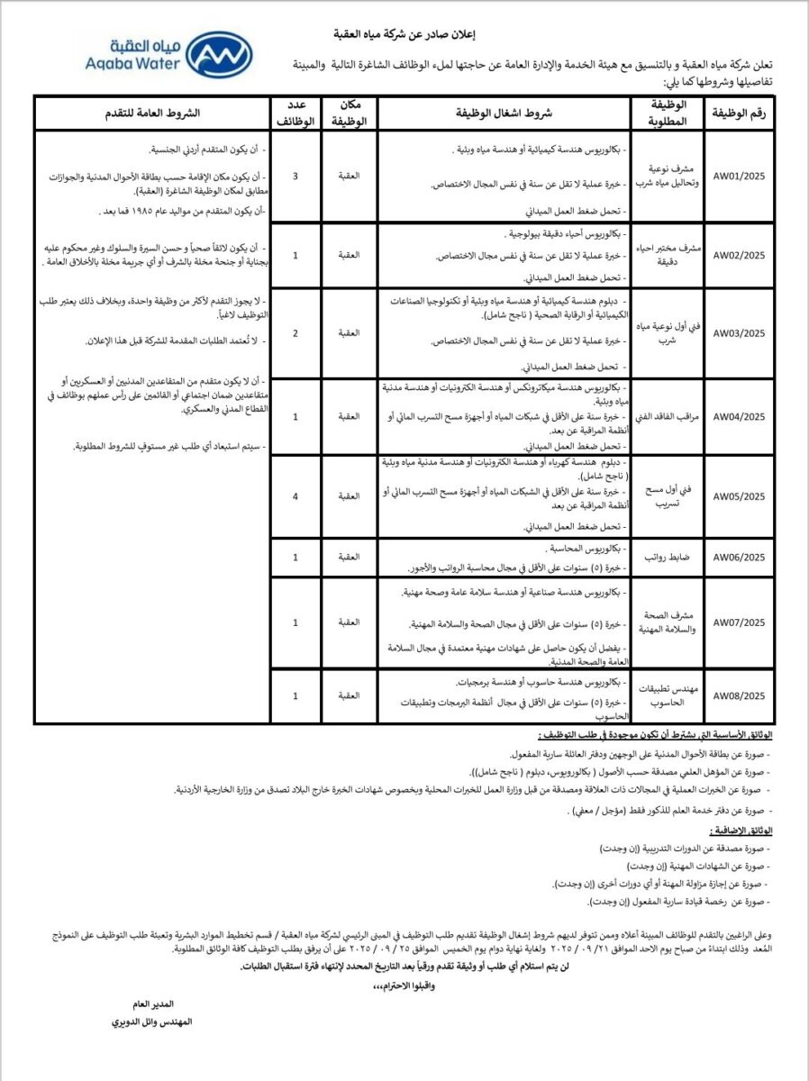 شركة مياه العقبة أعلنت عن وظائف شاغرة لعام 2025 في العقبة للتخصصات التالية:
