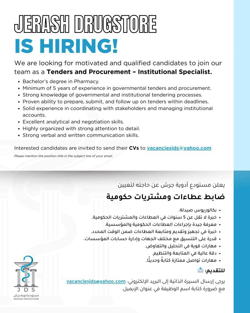 إعلان وظيفة ضابط عطاوات ومشتريات حكومية في مستودع أدوية جرش 2025