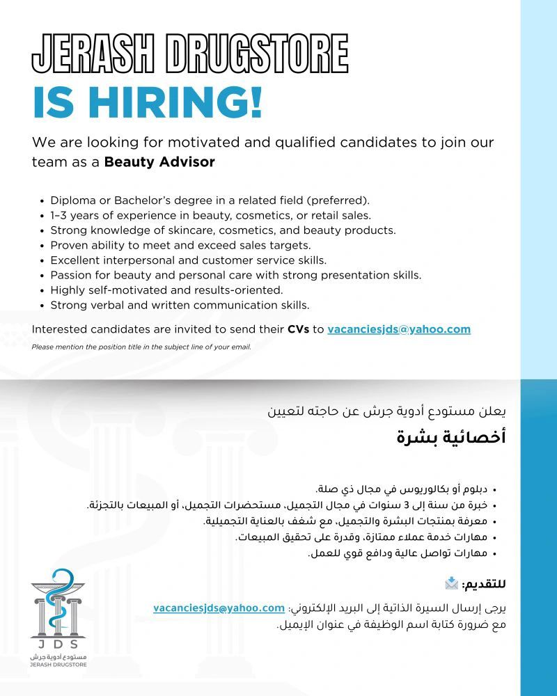 مستودع أدوية جرش يعلن عن حاجته لأخصائية بشرة للانضمام إلى فريقه. إذا كنتِ شغوفة بالجمال والعناية بالبشرة ولديكِ خبرة في هذا المجال، فإن هذه الفرصة لكِ!