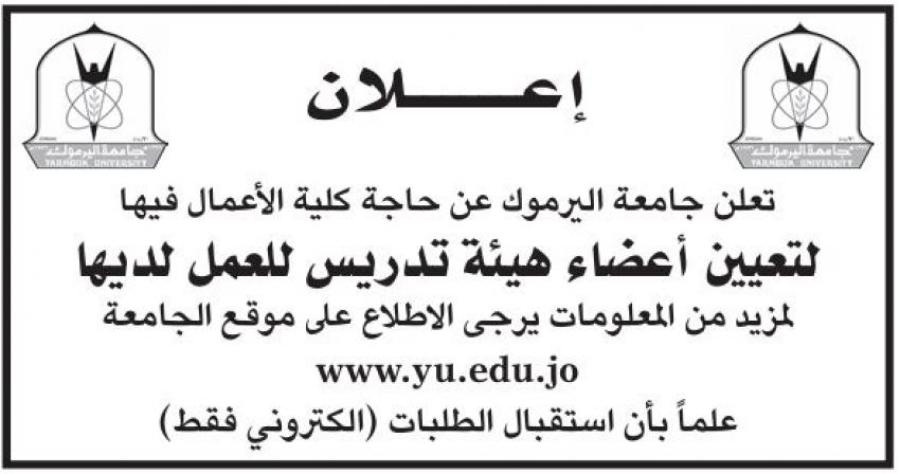 تُعلن جامعة اليرموك عن حاجتها لتعيين: