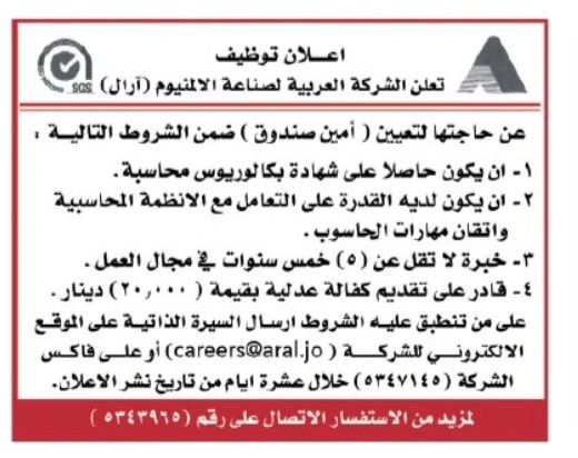 أمين صندوق – الشركة العربية لصناعة الألومنيوم (أزال).