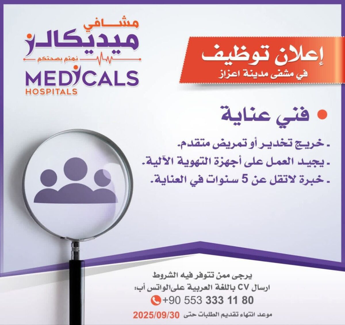 وظائف فني رعاية صحية – مستشفيات ميديكالز – مدينة عزيز 2025