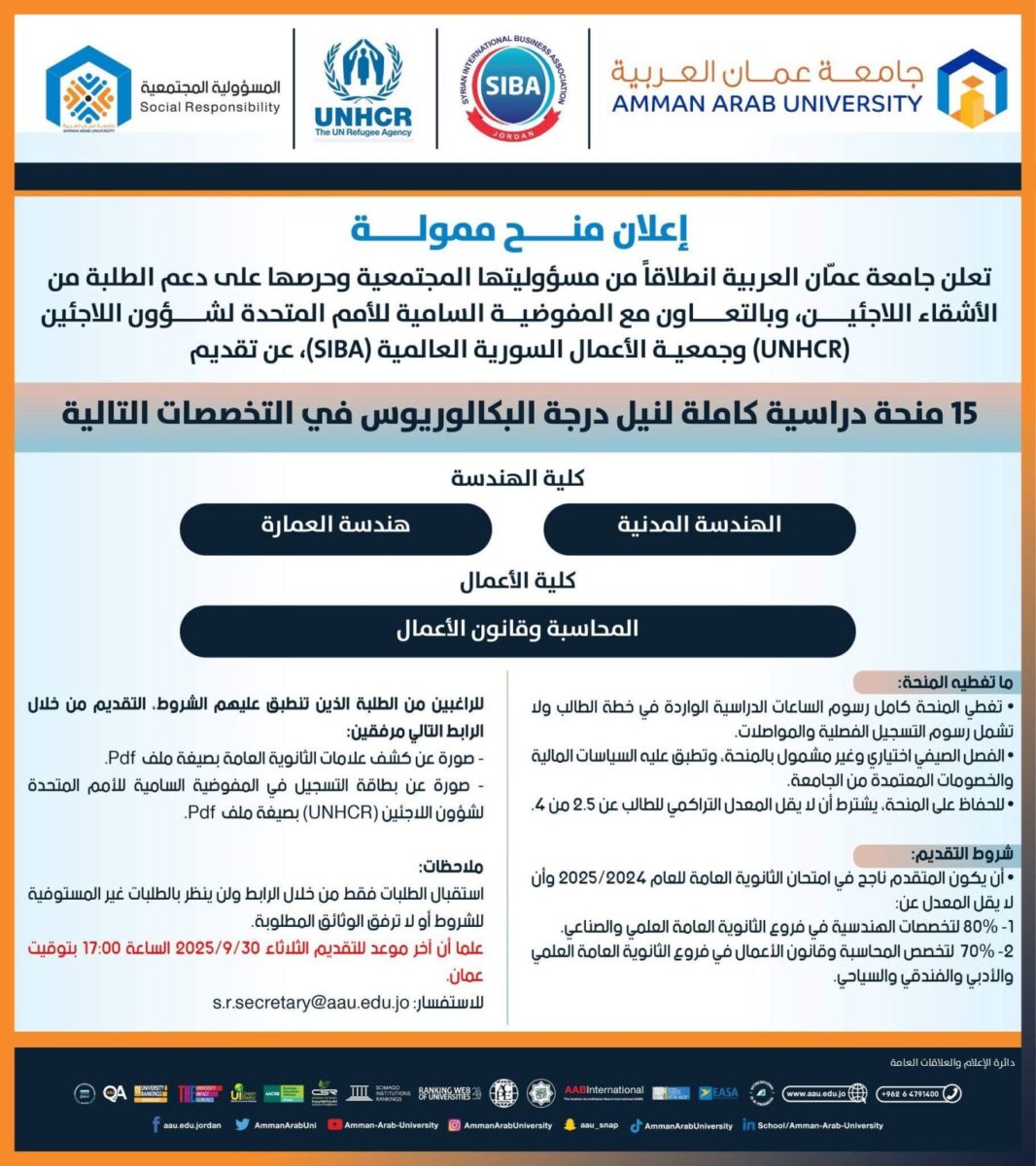 تُعلن جامعة عمان العربية عن فتح باب التقديم للحصول على 15 منحة دراسية ممولة بالكامل للطلبة من الأشقاء اللاجئين، للعام الجامعي 2024/2025، وذلك بالتعاون مع المفوضية السامية للأمم المتحدة لشؤون اللاجئين UNHCR وجمعية الأعمال السورية العالمية SIBA، ضمن جهودها في دعم التعليم والمسؤولية المجتمعية.