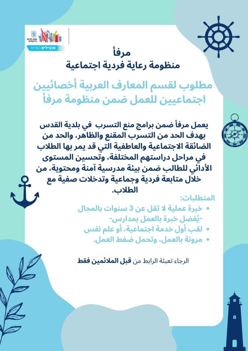 تعلن منظومة مرَفأ – رعاية فردية اجتماعية عن حاجتها لأخصائيين اجتماعيين للعمل ضمن قسم المعارف العربية في القدس لعام 2025، ضمن برامج منع التسرب ودعم الطلاب اجتماعياً وأكاديمياً.