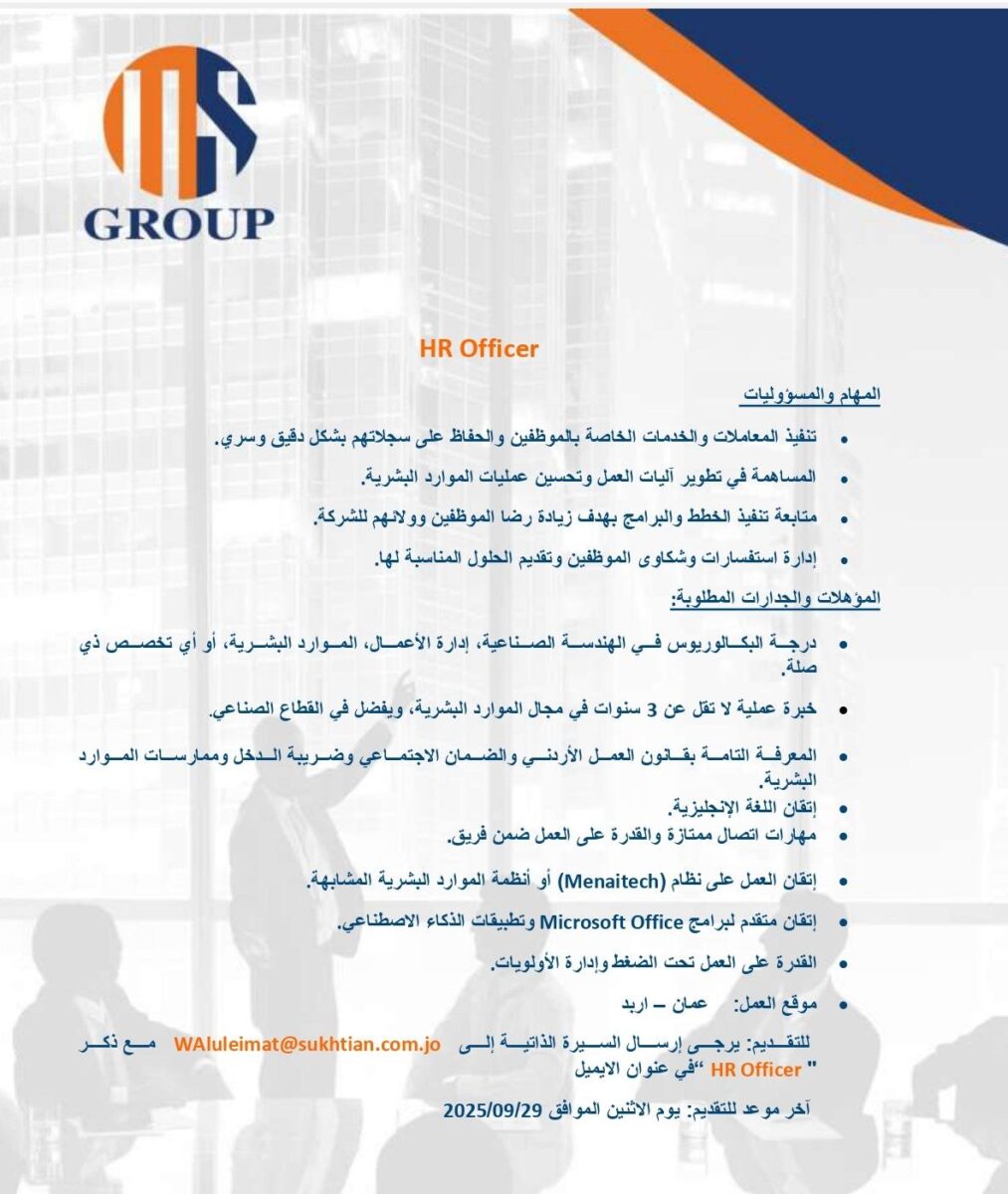 تُعلن شركة MS Group عن حاجتها لتعيين مسؤول/ة موارد بشرية (HR Officer) للعمل في مقر الشركة في عمان – الأردن.
