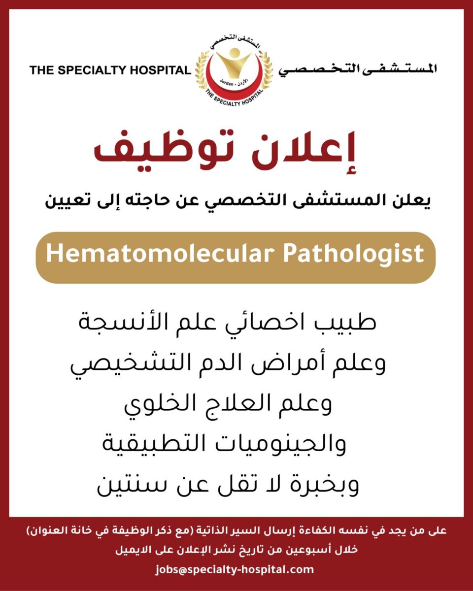 يُعلن المستشفى التخصصي في الأردن عن حاجته لتعيين Hematomolecular Pathologist (طبيب أخصائي في علم الأنسجة)، على أن تتوفر في المتقدّم المؤهلات التالية: