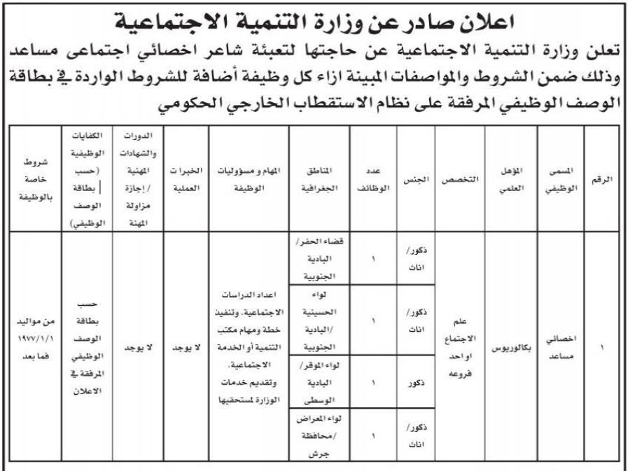 تعلن وزارة التنمية الاجتماعية عن حاجتها لتعيين أخصائي اجتماعي مساعد من حملة درجة البكالوريوس في علم الاجتماع أو أحد فروعه، ضمن نظام الاستقطاب الخارجي الحكومي، للعمل في مختلف المحافظات.