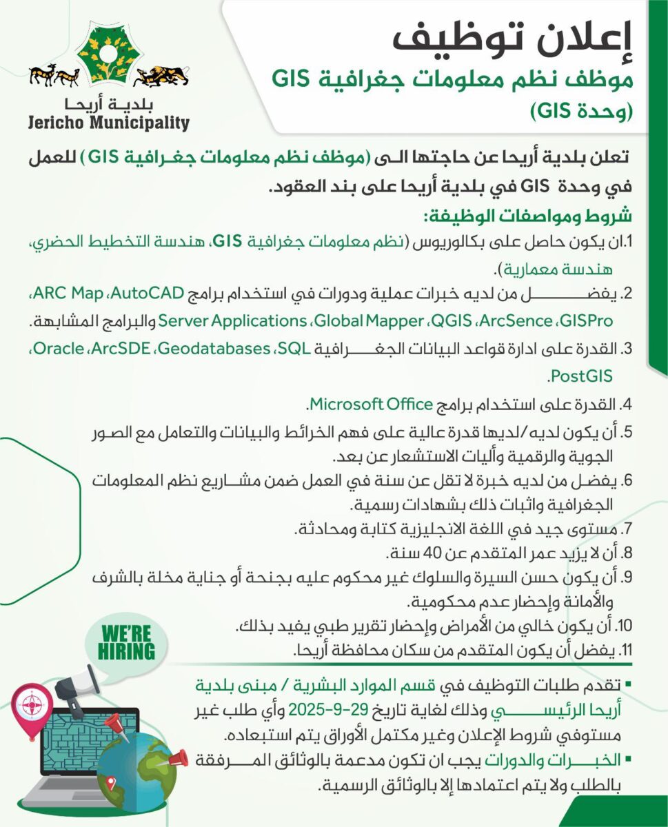 تعلن بلدية أريحا عن حاجتها إلى موظف نظم معلومات جغرافية (GIS) للعمل ضمن وحدة GIS بعقد عمل، وذلك حتى تاريخ 29 سبتمبر 2025.