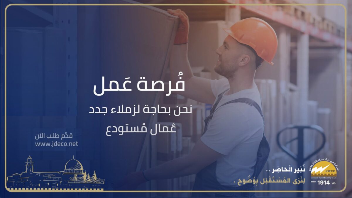 تعلن شركة كهرباء محافظة القدس عن حاجتها لتعيين عامل مستودع للعمل ضمن مستودعات الشركة في القدس، ضمن بيئة عمل مهنية ومحفزة.