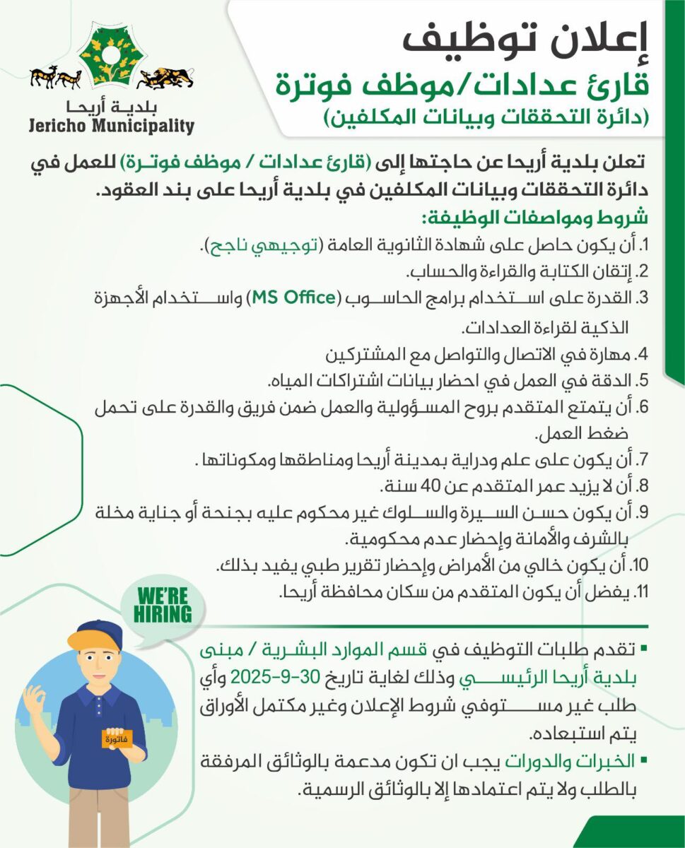 تعلن بلدية أريحا عن حاجتها لتعيين قارئ عدادات / موظف فوترة للعمل ضمن دائرة التحققات وبيانات المكلفين على بند العقود.