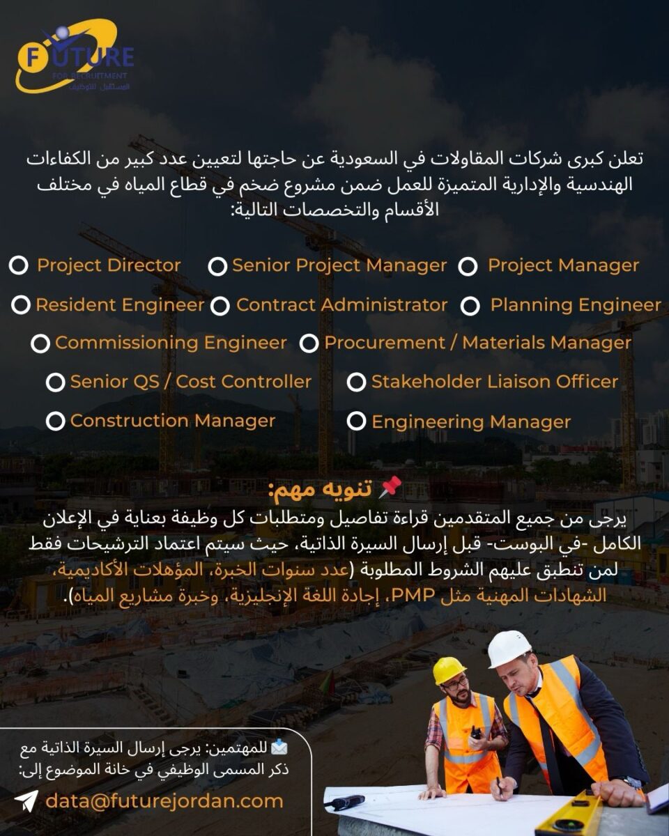 وظائف هندسية وإدارية – مشروع مياه ضخم – السعودية 2025