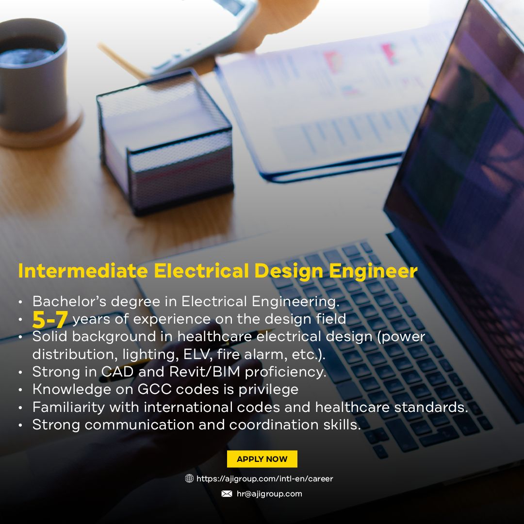 تعلن شركة AJi Group عن توفر وظيفة “مهندس تصميم كهربائي – مستوى متوسط” للعمل ضمن فريقها الهندسي المحترف في مدينة عمّان، بخبرة قوية في تصميم الأنظمة الكهربائية في مشاريع الرعاية الصحية.