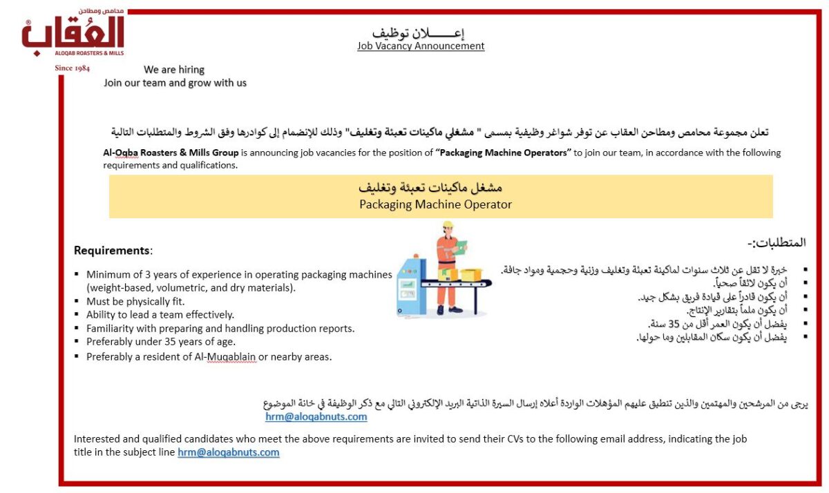تُعلن شركة العُقاب للمحامص والمطاحن عن حاجتها لتوظيف مشغلي ماكينات تعبئة وتغليف للانضمام إلى فريقها في منطقة الموقر، وذلك وفقًا للمتطلبات التالية: