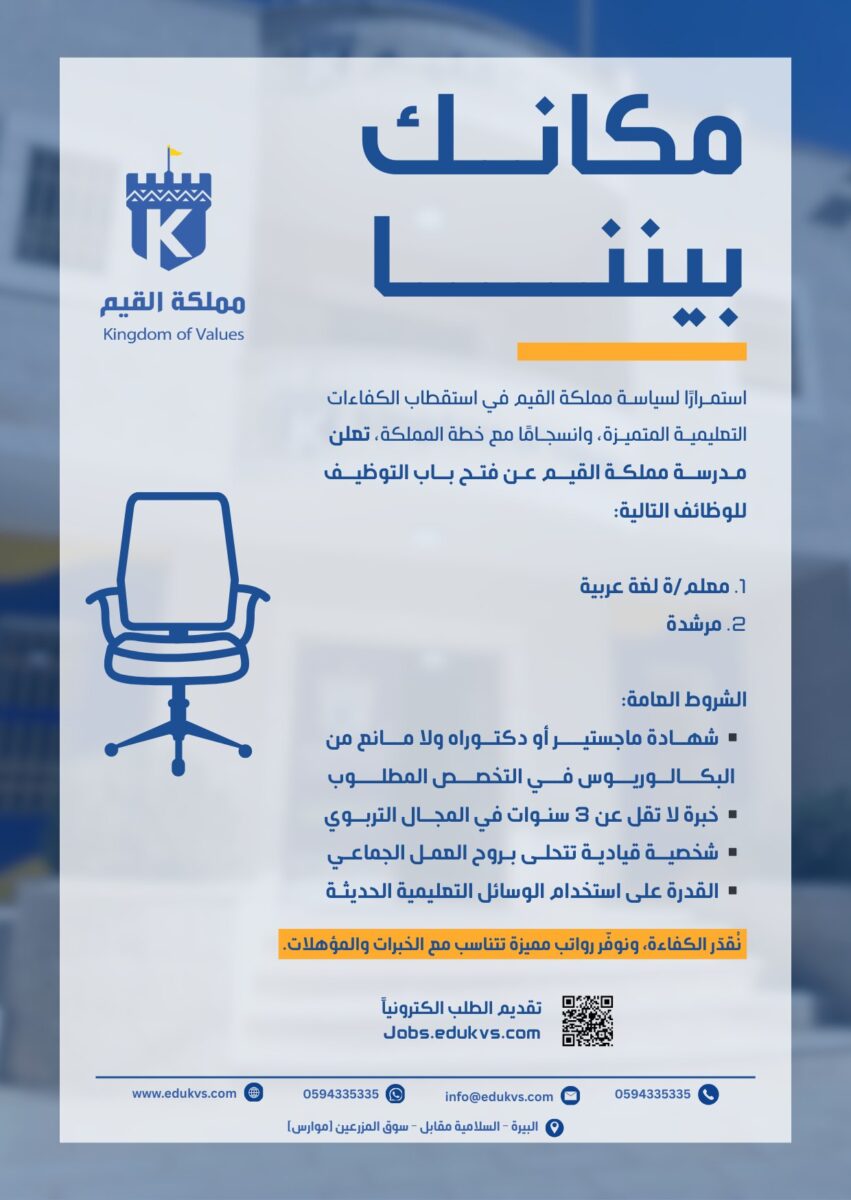 تعلن مدرسة مملكة القيم – رام الله والبيرة عن فتح باب استقبال طلبات التوظيف للعام الدراسي الحالي في التخصصات التالية: