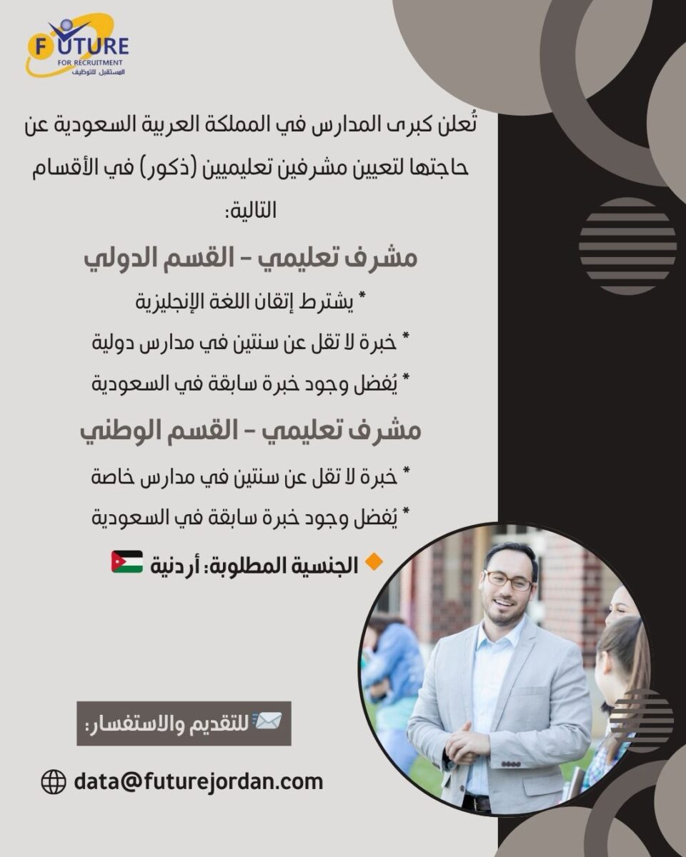 تُعلن كبرى المدارس في المملكة العربية السعودية عن حاجتها إلى تعيين مشرفين تعليميين من الجنسية الأردنية (ذكور فقط) في الأقسام التالية: