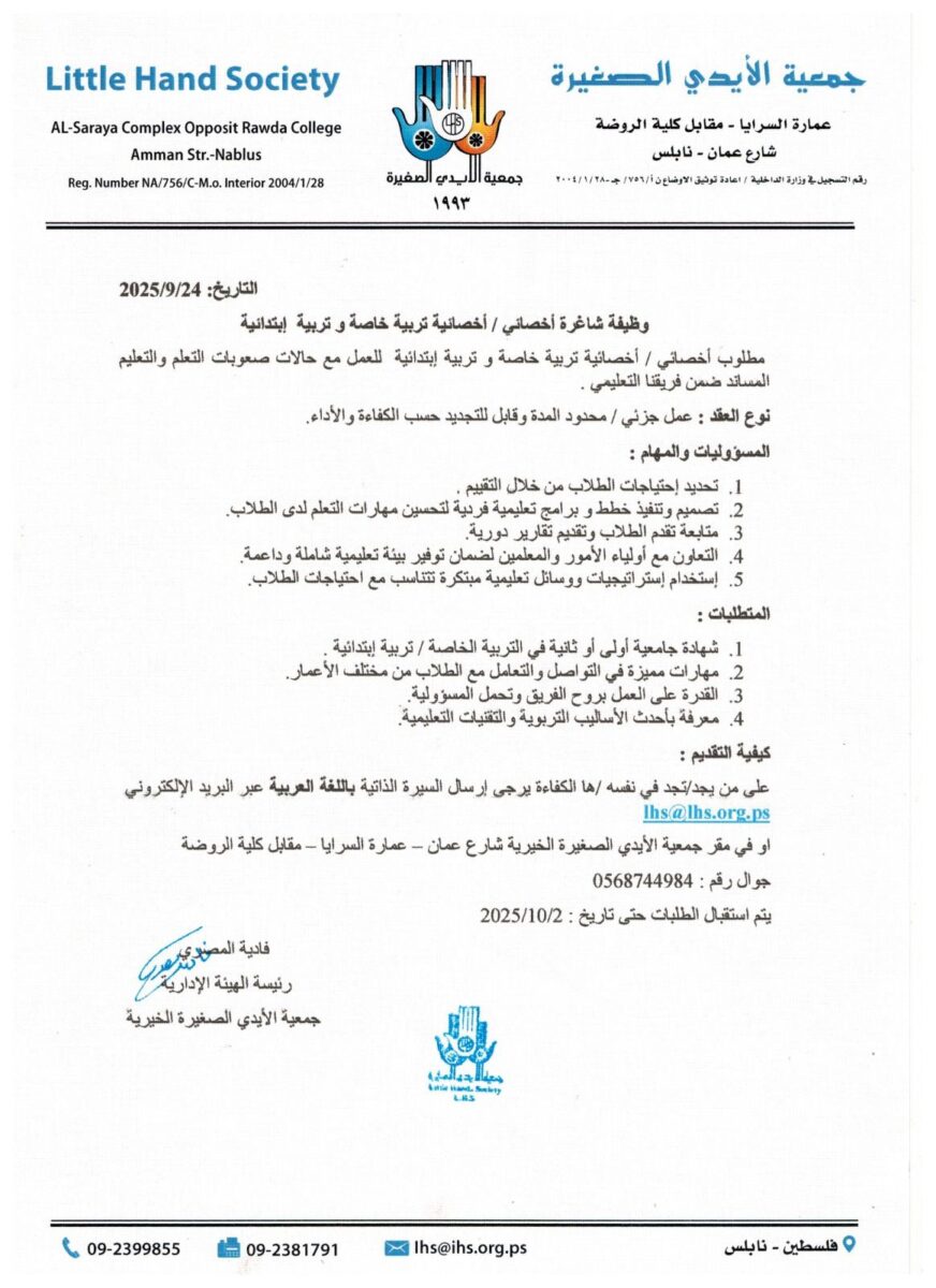 ✨ وظائف تربية خاصة – جمعية الأيدي الصغيرة – نابلس 2025 ✨