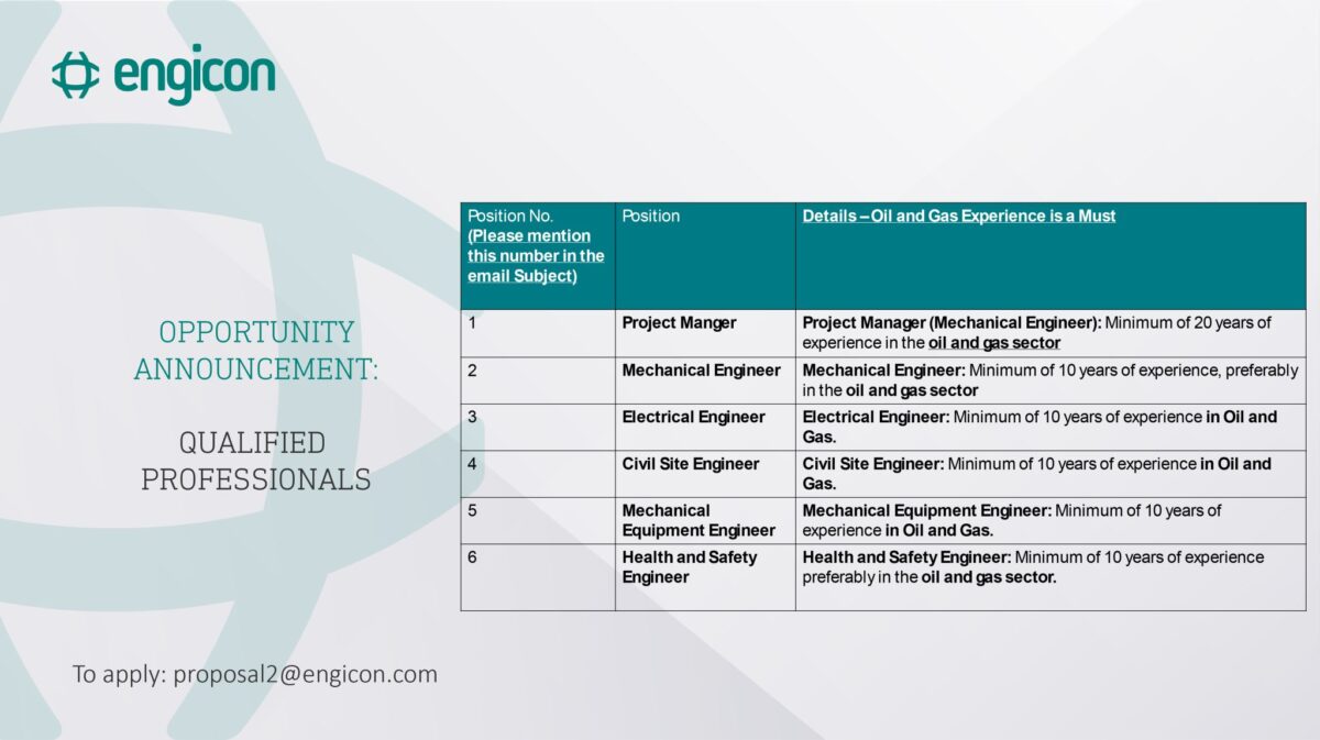 تُعلن شركة Engicon عن توفر فرص وظيفية مميزة للمهندسين المؤهلين في جنوب الأردن للعمل ضمن مشروع صناعي في قطاع النفط والغاز لعام 2025.