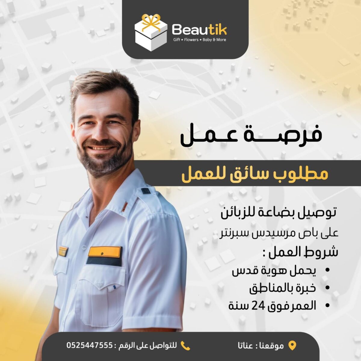 تعلن شركة Beautik المتخصصة في البيع بالجملة والتوزيع عن فتح باب التوظيف لوظيفة سائق باص مرسيدس سبرنتر للعمل في القدس – عناتا لعام 2025.