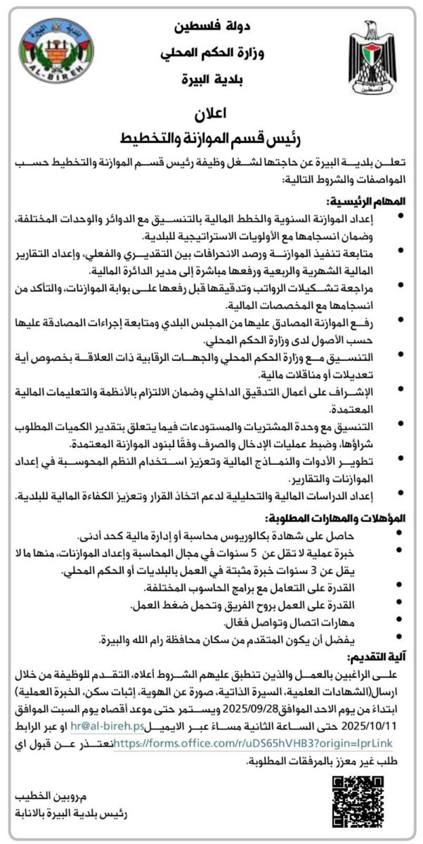 وظائف رئيس قسم الموازنة والتخطيط – بلدية البيرة – رام الله 2025