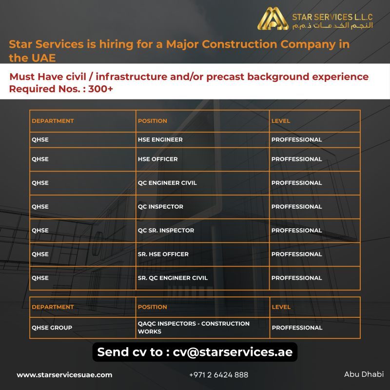 تعلن شركة Star Services عن فتح باب التوظيف لشغل أكثر من 300 وظيفة لصالح شركة إنشاءات كبرى في الإمارات – أبوظبي، ويُشترط وجود خبرة في مجال الهندسة المدنية أو البنية التحتية أو الخرسانة سابقة الصب (precast).
