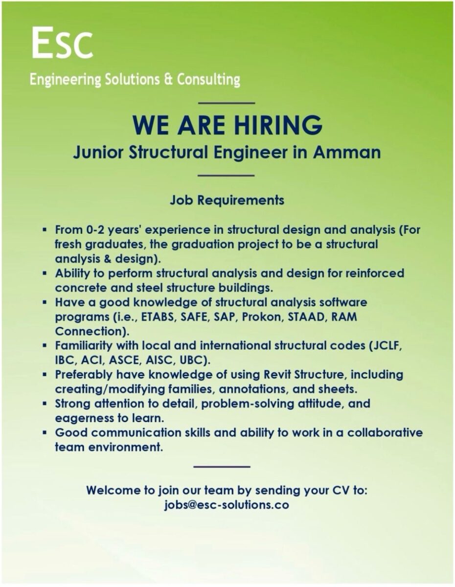 تعلن شركة ESC الرائدة في مجال الحلول الهندسية عن حاجتها لتعيين مهندس إنشائي مبتدئ (Junior Structural Engineer) للعمل في مقر الشركة في عمان، ضمن فريق احترافي يوفر بيئة تطوير مستمرة.