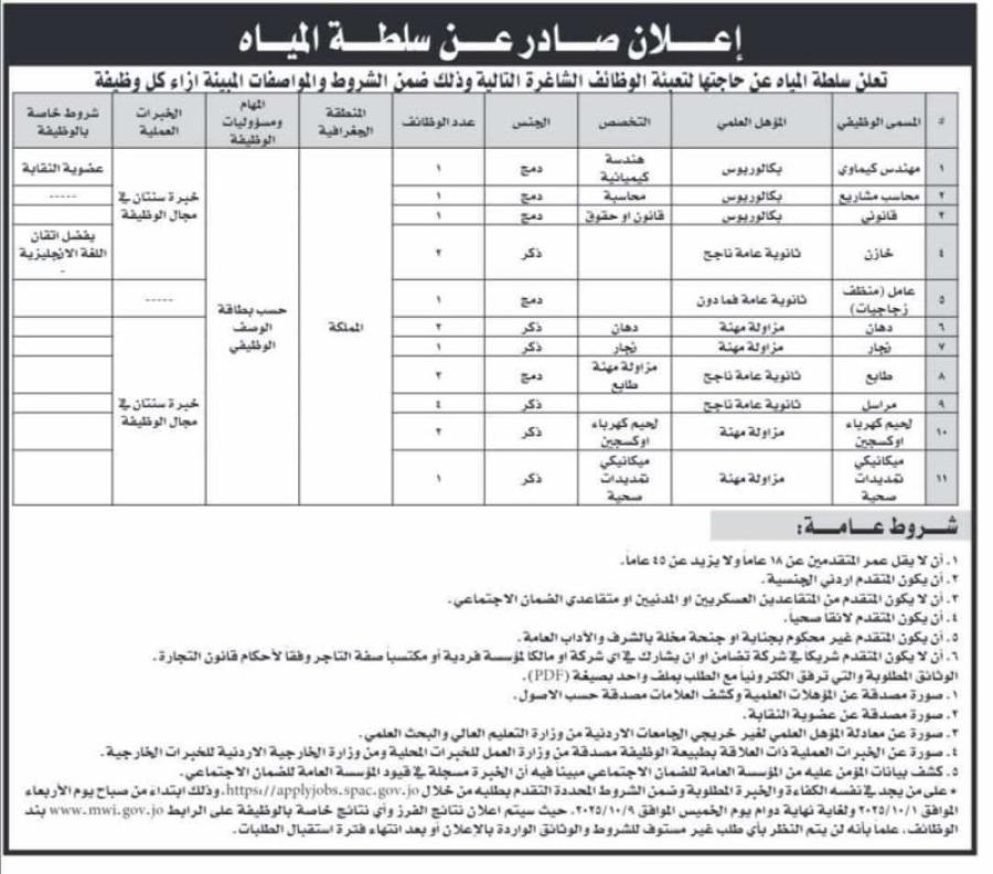 تُعلن سلطة المياه عن حاجتها لتعيين عدد من الموظفين من الذكور والإناث في مختلف التخصصات والمهن، وذلك ضمن الشروط التالية: