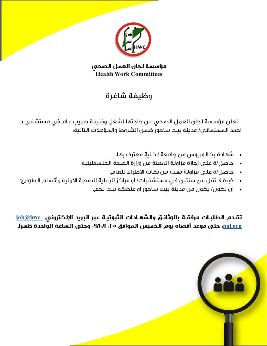 تعلن مؤسسة لجان العمل الصحي عن حاجتها لتعيين طبيب عام للعمل في مستشفى د. أحمد المسلماني بمدينة بيت ساحور – بيت لحم ضمن الشروط التالية: