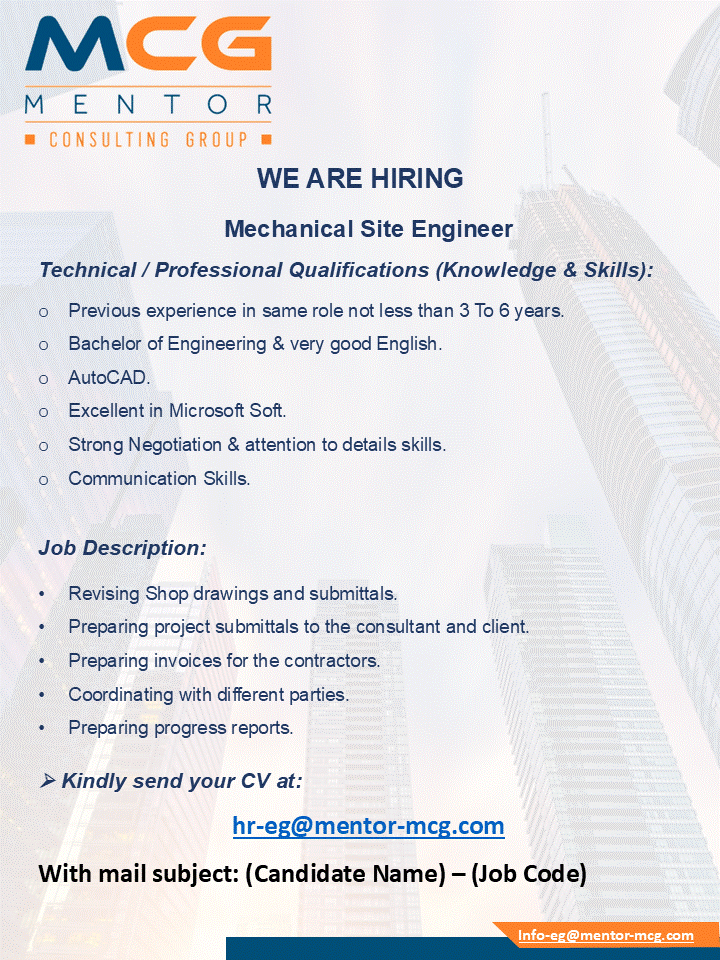 تعلن شركة Mentor Consulting Group (MCG) عن حاجتها لتعيين مهندس ميكانيكا مواقع للعمل ضمن مشاريعها في مصر لعام 2025.