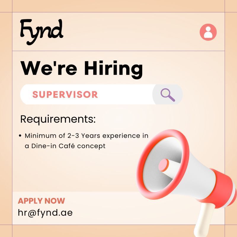 تعلن شركة Fynd عن توفر شاغر لوظيفة Supervisor في فرعها بدبي، ضمن مفهوم المقاهي Dine-in.