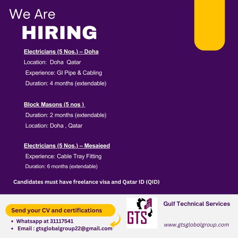 تعلن شركة Gulf Technical Services (GTS) عن توفر فرص عمل فنية في مواقع متعددة بقطر، تشمل تخصصات الكهرباء وأعمال البلوك، مع عقود قابلة للتمديد.