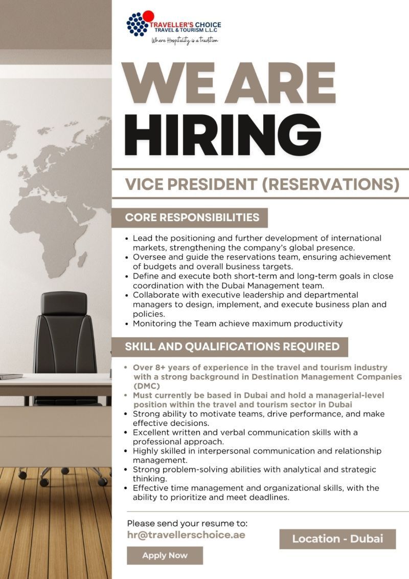 تُعلن شركة Traveller’s Choice Travel & Tourism L.L.C عن حاجتها لتعيين نائب رئيس (Reservations Vice President) ذو خبرة قوية في مجال السياحة وإدارة الوجهات (DMC).