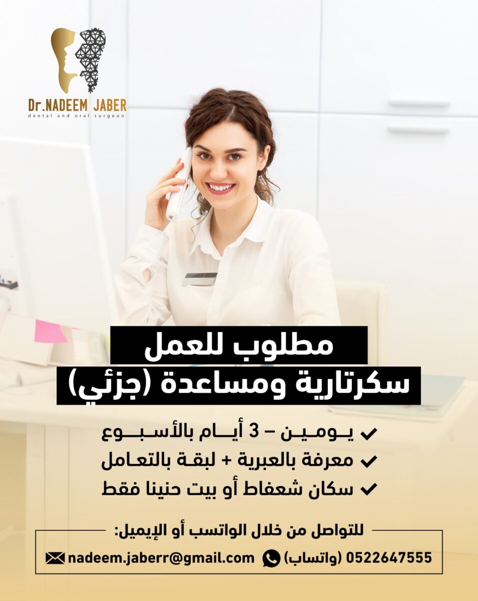 تعلن عيادة د. نديم جابر لطب الأسنان عن حاجتها لتعيين سكرتيرة أو مساعدة للعمل بدوام جزئي (يومين – 3 أيام بالأسبوع) ضمن فريقها في القدس.