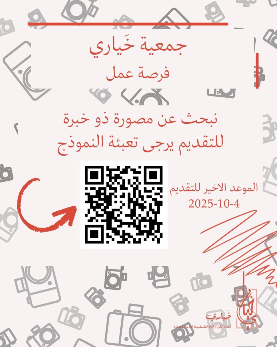 تعلن جمعية خَياري عن حاجتها لمصوّرة بورتريه بخبرة للعمل بدوام كامل بمدينة بيت لحم، مع التركيز على التصوير الإبداعي وصور البروفايل الرسمية للمشاركات.