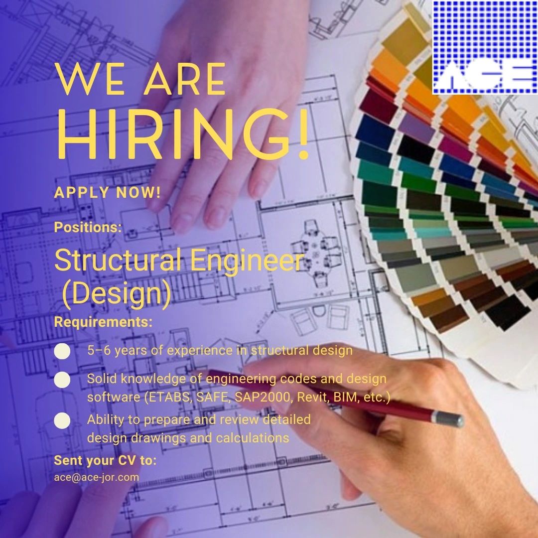 تعلن شركة ACE International – الأردن عن حاجتها لتعيين مهندس تصميم إنشائي (Structural Engineer – Design) للانضمام إلى فريقها الهندسي في العاصمة عمّان.