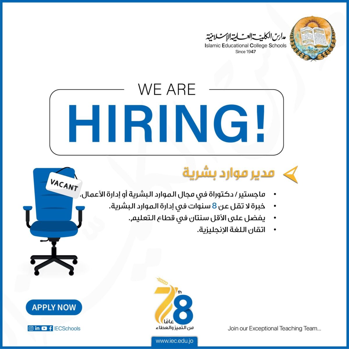 تعلن مدارس الكلية العلمية الإسلامية (IEC) عن توفر وظائف شاغرة للأردنيين في مختلف التخصصات التعليمية والإدارية وفق الشروط التالية: